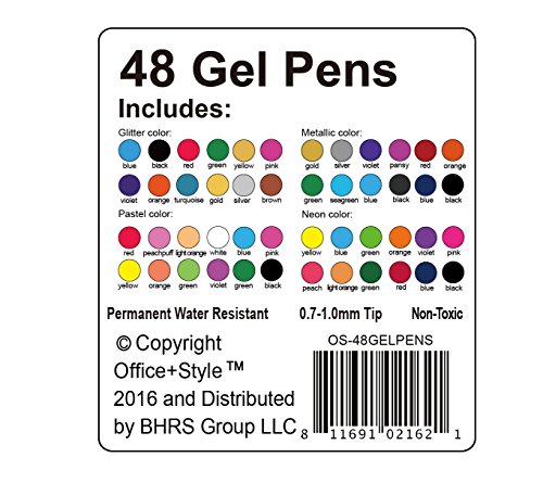 -. Feature : 48 PROFESSIONAL QUALITY GEL PENS: These pens provide you with superior, long-lasting, vibrant colors that will not skip, smear, or fade. Use the easy glide ink to maintain smooth lines in a flowing, regular pattern! / NON TOXIC & GREAT FOR ALL AGES: All Office Style gel pens are safe for children as they are both non-toxic and acid free. The special inks are both permanent and water resistant, so kids never have to worry about blurring their artwork! / PERFECT FIT TRAYS: To make sure all of the gel pens stay safe and are easily accessible, they come with four specially designed trays which are specifically molded to hold them securely inside their box. Trays also make cleanup a snap. / EXCITING VARIETY OF PREMIUM COLORS: Be ready for any art project with Office Style's set of gel pens! You have all of the colors of the rainbow at your fingertips! Each set of gel pens includes classic colors, and so much more! / 100% SATISFACTION GUARANTEED: Office Style understands the importance of self-expression. If for any reason you are not satisfied with our gel pen set, please contact our customer care team, and let us make it right!