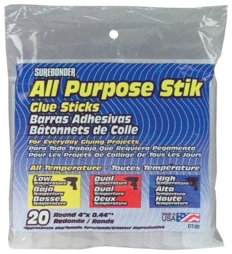 Surebonder DT-20 All Temperature Glue Sticks is an all-temperature hot melt adhesive that works at either low temperature (230 degrees F) or high temperature (380 degrees F) for everyday gluing projects. Use with high or low temperature glue guns. Bonds to metal, wood, paper, fabric, magnets, ceramics, floral arrangements, glass and plastic using a high temperature glue gun. Bonds to delicate materials such as balloons, ribbon, lace and children's crafts using a low temperature glue gun. Clear color with 60-65 second working time. 7/16 -Inch diameter by 4-Inch length. 20 sticks per bag.Feature