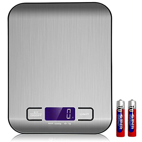FISKTOOL Digital Kitchen Scale (FT-02-003),Multifunction Food Scale, 11 lb 5 kg, Silver, Stainless Steel (Batteries Included)