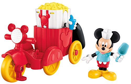 -. Feature : Push down, and out pops the popcorn shop / Cargo is detachable, to create a delivery trike and popcorn stand / Snap Mickey onto the delivery trike and go for a ride / Mickey figure bends at the waist / Collection also includes Pop-Up Bubble Gum Shop, Hot Dog Shop, Ice Cream Shop, and Balloon Shop