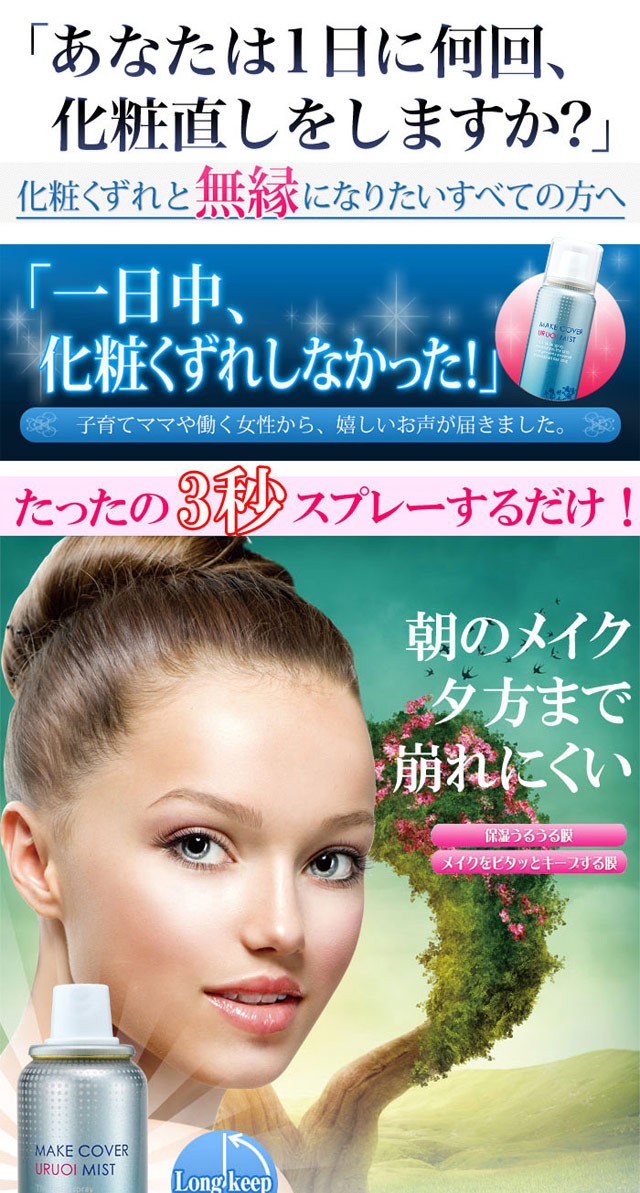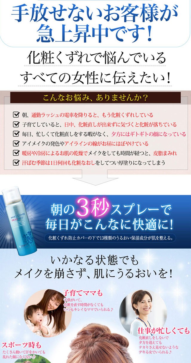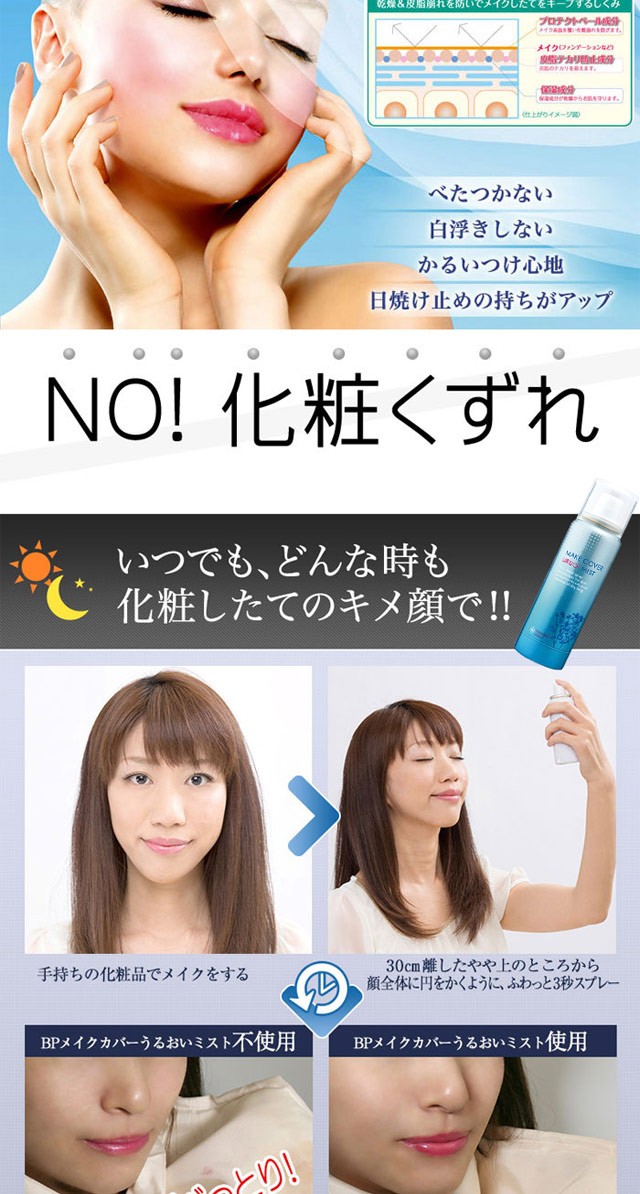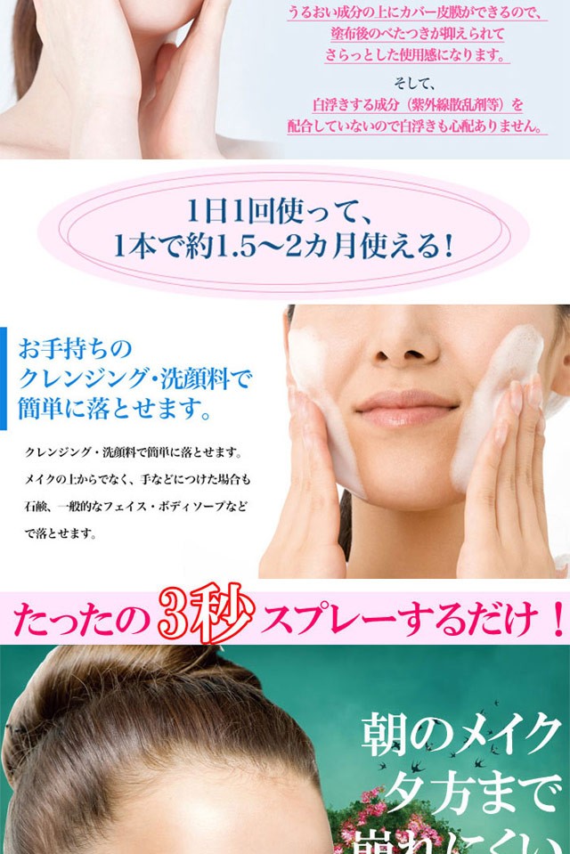 メイク後、お肌から30cmほど離して、目を閉じて顔全体にスプレーした後、お肌になじませて乾かしてください。 ※缶は立てた状態で、振らずにご使用ください。 |
