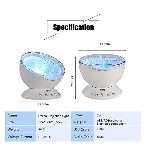 7 colorful projection mode. 1.Red, blue, green three lights on.(Romantic Atmosphere) 2.Red blue, red green, blue green, two color light quick flash.(Colorful) 3.Red blue light lighting.(Purple Atmosphere) 4.Blue light lighting.(Blue ocean) 5.Green light lighting.(Green aurora borealis) 6.Red blue, green cycle lighting.(Magic zone) 7.Red blue green cycle quick flash.(Disco effect) 0