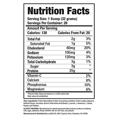 Purbolics Protein consists of Whey Concentrate and Whey Isolate. There are 25 grams of Protein per scoop and 28 Servings in a tub.
