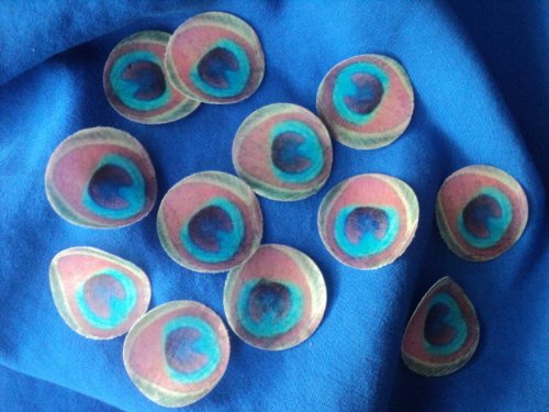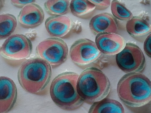 48 round small PEACOCK FEATHERS Edible Image Wafer Paper feathers Pre-cut Cake Toppers