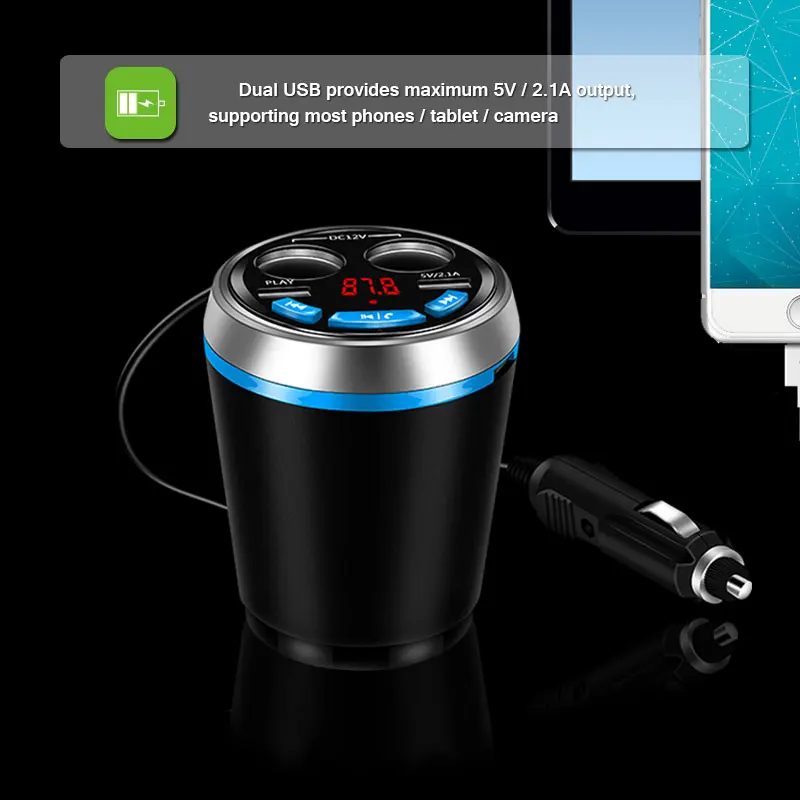 3 in 1 Multifunction cup type car kit: Bluetooth FM transmitter modulator + Dual cigarette lighter socket + Dual USB charger.
