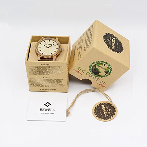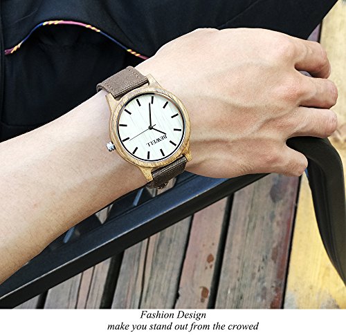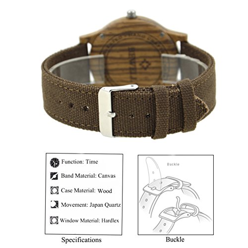 -. Feature : High quality Japanese imported movement, keep the time precise, and it is accurate to within 26 seconds per year / Unique wooden material watch case, lightweight and textured, also gives you a feeling of closing to nature / The dial match with the simple but concise dial, openhanded and elegant / Battery life is up to 36 months, very durable / 50 mm bamboo case and adjustable brown canvas strap, fit for men and women