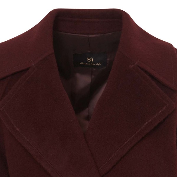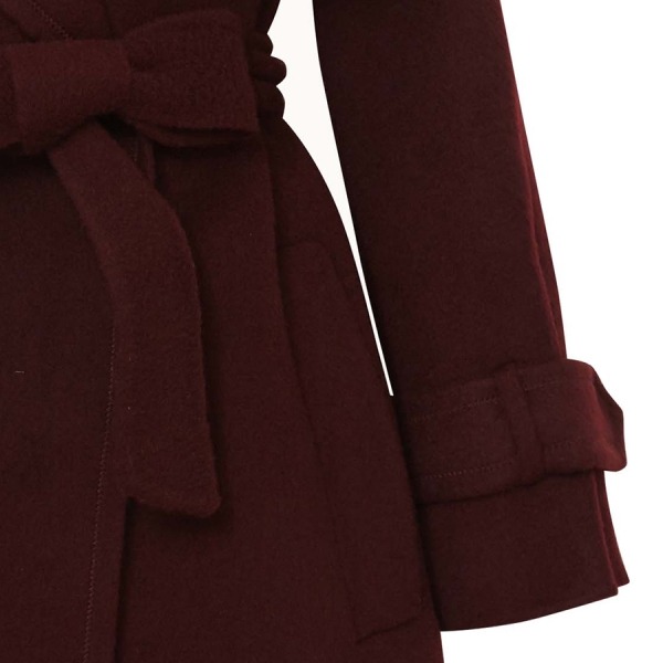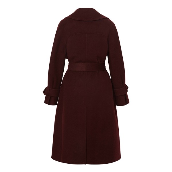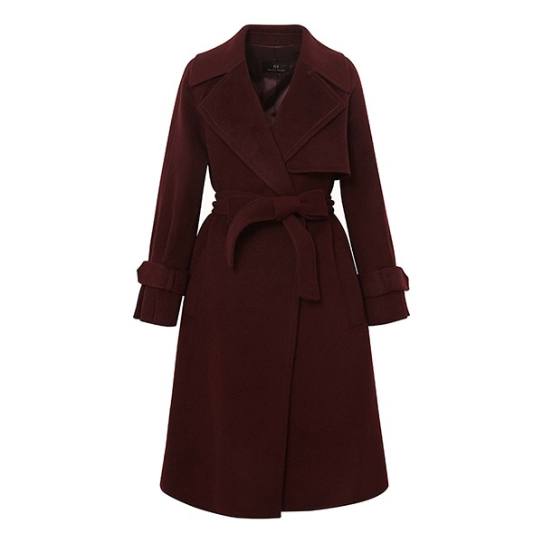 어깨라인이 부드럽게 떨어진 벨트 모직 코트입니다