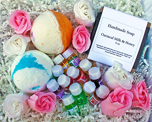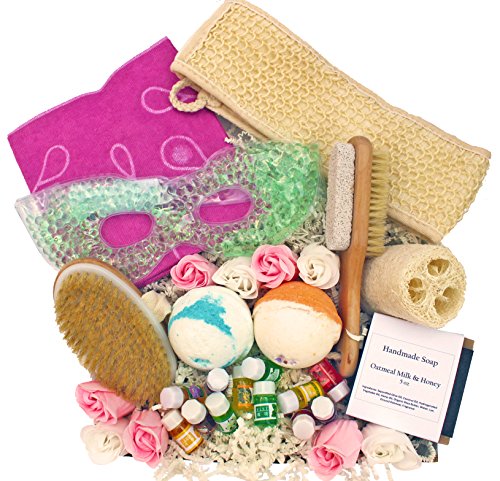 Giftology Spa Gift Set Includes: 1 Handmade Cool Water Large Size Bath Bomb; 1 Handmade Cool Water Large Size Bath Bomb; 1 Bar of Handmade Oatmeal Milk & Honey Soap; 12 Bottles of Aromatherapy Essential Oils-each one contains 3 ml of oil - Scents: Jasmine, Rose, Rosemary, Osmanthus, Lavender, Tea Tree, Violet, Sandalwood, Lemon, Mint, Lily Honeysuckle; 9 pieces of rosebud soap; 1 Full Sized, Terry Cloth Front Bath Pillow with suction cups; 1 Natural bristle brush; 1 Natural bristle brush with pumice stone; 1 Exfoliating Back Scrubber with handles; 1 Natural Loofah; 1 Cooling Eye Mask. Luxury spa appreciation gift basket set with bath bombs, essential oils, natural bristle brushes for skin brushing, and lush soaps. Perfect as a holiday gift, birthday gift, or thinking of you gift for mom, wife, girlfriend, daughter or any special woman in your life. These lush products will delight the special woman in your life. This spa bath and shower gift set contains beautiful rose bud soap with delicate petals. Bring the pleasure of a luxury spa to your home and feel the relaxation with this deluxe spa kit. Give the ultimate stress relief spa kit basket. This pampering set and body wash set contains two fizzy bath bombs and is a great bath soap gift set. This is the best gift for woman, gift for teen, gift for wife, gift for boss. This will give the woman in your life the ultimate spa experience. The perfect holiday gift for your loved ones. The Giftology high end bath set includes everything you need to create the definitive at-home spa experience from start to finish. Spa Gift Sets moisturize and refresh the body, and revitalize the mind and spirit. Expressing your love, lifting someone's spirits, or just letting that special person know you are thinking about him or she has no designated day. The unique quality and distinctive fragrances of all Giftology's products express perfectly and always that person is special to you.Feature
