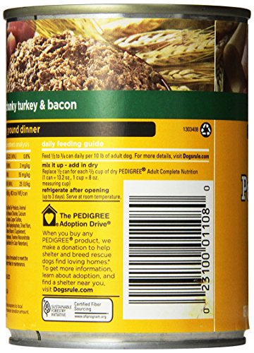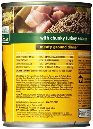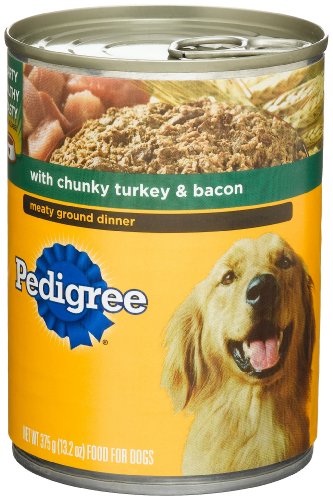 Contains twenty-four (24) 13.2-ounce cans of PEDIGREE Meaty Ground Dinner With Chunky Turkey and Bacon Canned Dog Food