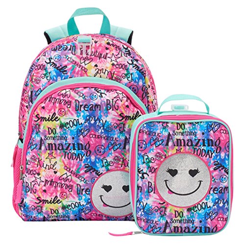 -. Brand : Fashionably Fun -. Color : Pink, Purple, Blue, Multi -. Department : girls -. EAN : 0635648136745 -. Feature : Includes Large 17' canvas backpack & lunch bag with Zippered main compartment and front compartment, 17" x 12.5" x 5.25" / School backpack with adjustable padded shoulder straps and mesh side pockets / Zip lunch bag attaches to backpack, Insulated lunch bag 9" x 7.25" x 3.125" / Inspirational themed backpack with Glitter smiley / Spot clean only -. ProductGroup : Apparel -. ProductTypeName : LAGE -. Size : Large -. Title : Tie Dye Emoji School Backpack & Lunch Bag Set - Girls -. UPC : 635648136745