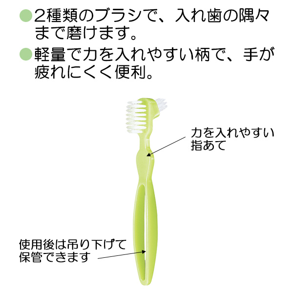 ●入れ歯の平らな部分、くぼんだ部分を2種類のブラシで、すみずみまできれいに磨けます。