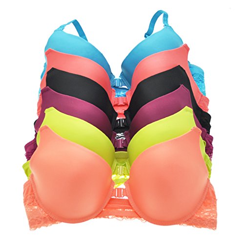 Sexy is back with our lace winged front-closure padded demi-cup bras. The beautiful lace back lets you proudly show them off and avoid the awkward hook-and-eye part of an ordinary bra when wearing backless clothings. Made from 85% nylon and 15% spandex, Hand wash in cold water, line dry. Get 6 bras in a pack in assorted colors.Feature