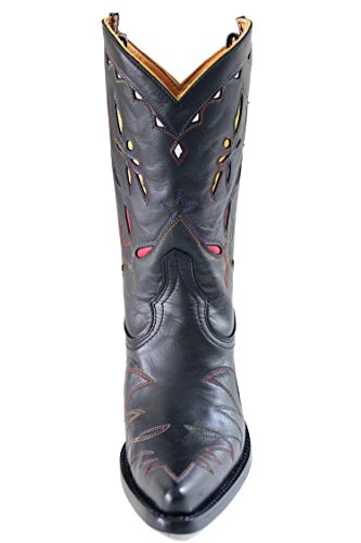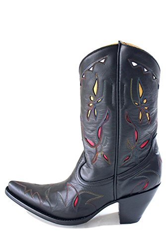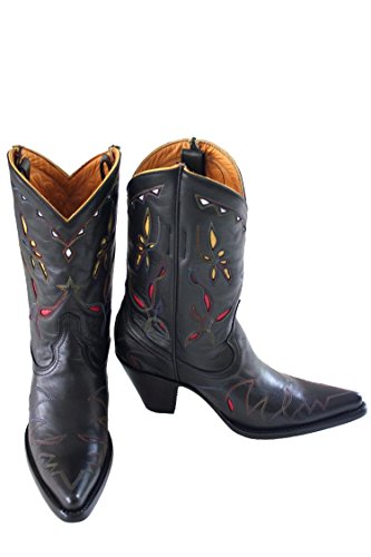 Binding : Apparel Product Description Old Gringo Reno Variegated Black Womens Boots L068-8. Old Gringo Reno Variegated Black is handmade in good ol' Mexico for Boot Star by Old Gringo. The Reno is a vintage inspired design. A 10" boot with beautiful black calf skin, featuring hand-cut inlays on foot and upper and variegated rainbow stitch throughout. Red, white, and yellow inlays; yellow piping on scallop; inside pull straps. This western-inspired fashion cowgirl boot strikes the perfect balance between dress and casual style and comfort. Old Gringo boots go through a 130 step handmade production process. Old Gringo also develops and tans its own leathers and textures to ensure the results are the highest quality cowboy boots. Founded in 2000, Old Gringo combined exceptional boot making craftsmanship and design skills with 30 years of experience in leather manufacturing to create western wear and cowboy boots of superior style and quality. Old Gringo pushes the envelope with artisan handcrafted men's and women's cowboy boots and western wear that both captures the traditional Old School quintessential vintage charm and detail while offering contemporary cutting edge styles not surpassed by ordinary boot makers. Appealing to both the fashion boot loving and the professional, the Old Gringo boot collection continues to grow each season with new cowboy boot styles ranging from unique interpretations in Traditional Western, Vintage and Retro, Contemporary Fashion, Rock Star, Equestrian, and European Vogue.We are proud of our long-standing relationship with Old Gringo, and happy to offer both menes cowboy boots and cowboy boots for women -- many are exclusive Boot Star custom designs! -- which combine style, comfort and value on the foundation of superior handmade footwear -- designs that bridge the divide between western boot style and pure fashion. 0