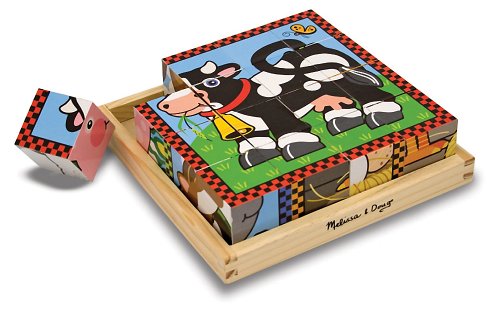 - 16 colorful cube-shaped puzzle pieces in a sturdy wooden tray with border design that gives visual hints to each puzzle.