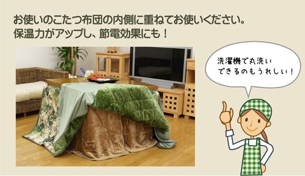 両面にあったか素材のアクリルを使用した高脚用のこたつ中掛け毛布です。あたたかく、ふっくらとした感触があり、耐久性にも優れています。掛け布団とこたつ台の間に入れれば、保温性のアップと電気代の節約にも効果があります。