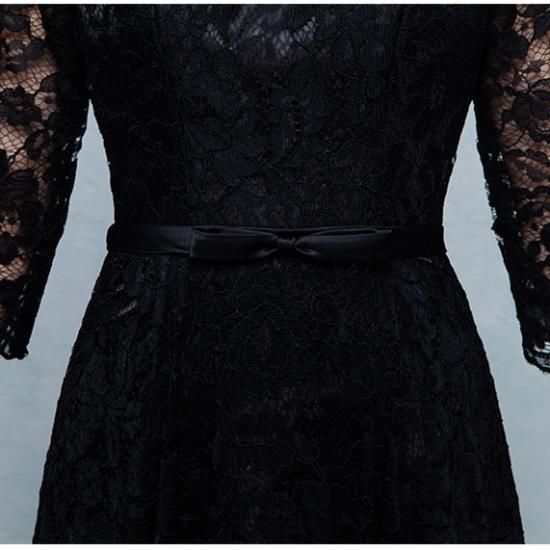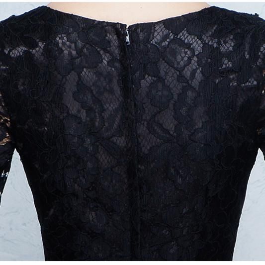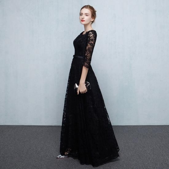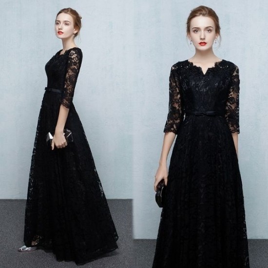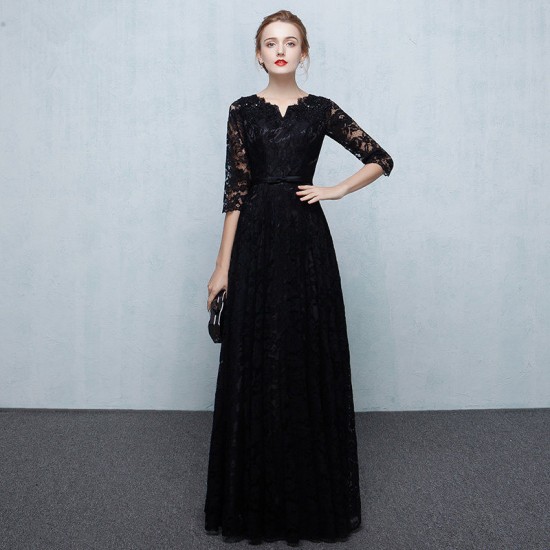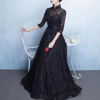 フルレングスの、ブラックレースロング丈ドレス。