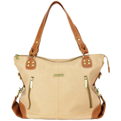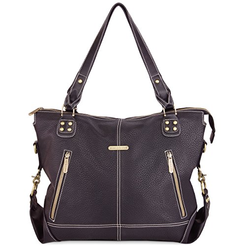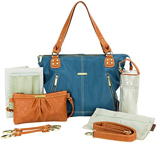 The Kate bag's upscale sophistication will make you the envy of all the moms on the block. It's made from easy to clean vegan faux leather (PVC free) and features our custom hardware in an antique brass finish. Kate comes with many functional and fashionable accessories, some of which you never knew you needed, including: A cross body, adjustable detachable strap so you can wear it hands free whenever you need to; Our specially designed changing pad with a front mesh pocket where you can store your diaper wipes and creams when you need to make a quick diaper change trip; A zippered sac to put away soiled clothes; A stylish clutch that you can use as your purse (who wants to carry a purse and a bebe bag?) with interior credit card slots and an inside zipper pocket; An insulated bottle tote to keep your baby's bottle warm or cool; Matching stroller straps so you can hang your bebe bag from your stroller; Water resistant, light colored lining so you can easily see everything in your bag; Three exterior pockets and six interior organizational pockets; Inside key fob - never lose your keys.Feature
