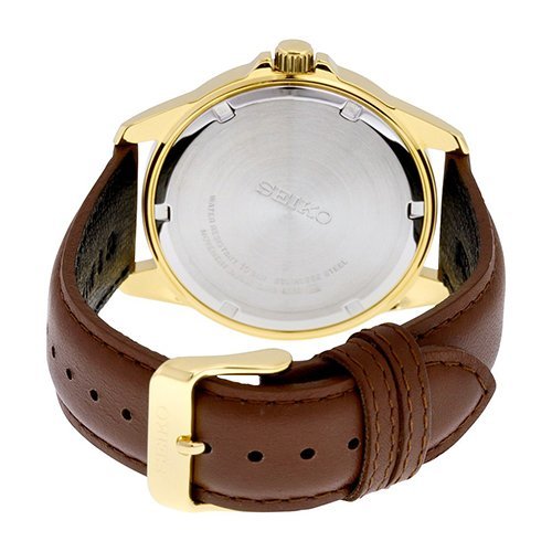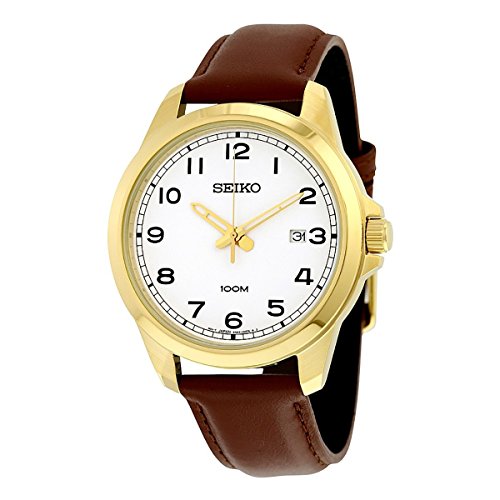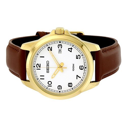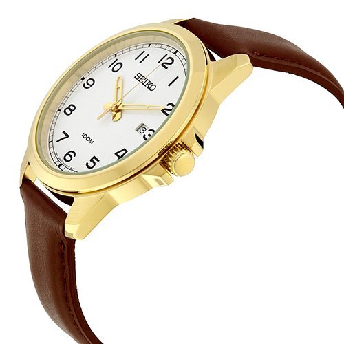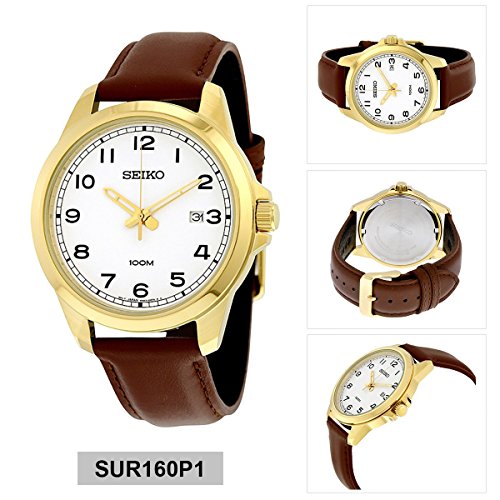 Gold-tone stainless steel case with a brown leather strap. Fixed gold-tone bezel. White dial with gold-tone hands and Arabic numeral hour markers. Minute markers around the outer rim. Dial Type: Analog. Date display at the 3 o'clock position. Quartz movement. Scratch resistant mineral crystal. Solid case back. Case diameter: 42 mm. Case thickness: 10 mm. Round case shape. Band width: 20 mm. Tang clasp. Water resistant at 100 meters / 330 feet. Functions: date, hour, minute, second. Casual watch style. Watch label: Japan Movt. Seiko White Dial Brown Leather Quartz Mens Watch SUR160.Feature