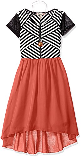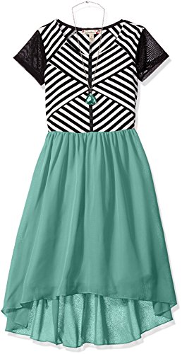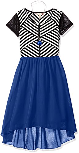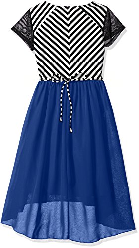 Knee length dress with a striped cap sleeve top to a solid high low chiffon skirt