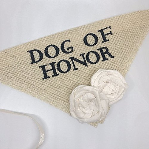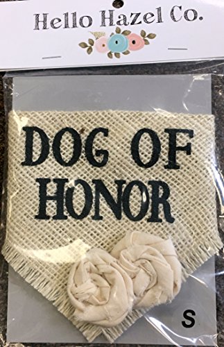-. Binding : Misc. -. Brand : Hello Hazel Company -. Feature : High quality ivory burlap and rolled ivory cotton flowers / Professionally screen printed saying / Fully Adjustable / Great for engagement photos, save the date cards and wedding photos / USA Made -. Label : Hello Hazel Company -. Manufacturer : Hello Hazel Company -. PackageQuantity : 1 -. ProductGroup : Pet Products -. ProductTypeName : PET_SUPPLIES -. Publisher : Hello Hazel Company -. Studio : Hello Hazel Company -. Title : Dog of Honor Wedding Pet Bandana with Ivory Flowers