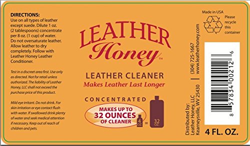 - Feature : Concentrated formula means great value! Each four-ounce bottle makes up to 32 ounces of leather cleaner when diluted with water! / Works quickly to gently cleanse leather of dirt, oil and grime. Works on vinyl and faux leather, too! Not for use on suede. / Perfect leather cleaner for every leather product, including saddles and tack, automotive interiors, furniture, handbags, shoes and jackets. / Non-toxic and Made in the USA. 100% satisfaction guarantee -- if you're not happy with any of our products, simply return them for a full refund of your purchase price! / Formulated to work with Leather Honey Leather Conditioner, the #1 leather conditioner on Amazon.