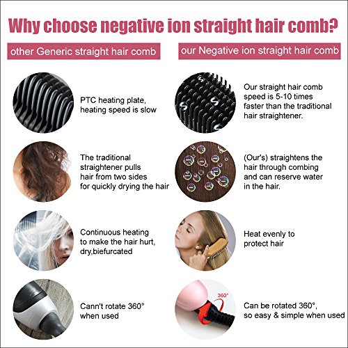 HYDRATING IONIC TECHNOLOGY-This hair straightener brush features an ion generator that produces powerful hydrating ions which help moisturize your hair, gives you shiny, silky smooth, and natural healthy hair, and also provides a massaging effect that benefits the scalp and simulates hair follicles.