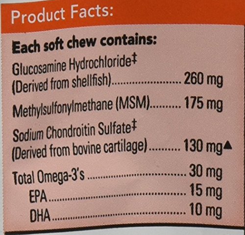 #1 Vet recommended maximum strength chew with MSM for mobility, cartilage and joint support plus Omega-3's for a heather skin and coat.