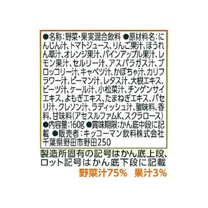 원재료:(당근)인삼즙,토마토 쥬스,사과 과즙,시금치즙,오렌지 과즙,파인쥬스 애플 과즙,레몬 과즙,셀 리즙,아스파라거스즙,브로콜리즙,양배추즙,호박즙,콜리플라워즙,피망즙,양상추즙,무우 엑기스,비츠즙,K《루》즙,평지의 변종즙,친 겐 코뿔소 엑기스,읽 # 엑기스,타마 파 엑기스,파슬리즙,《구레손》즙,래디시즙,신맛료,향료,감미료(assessment《루후무》K,《스쿠라로스》)