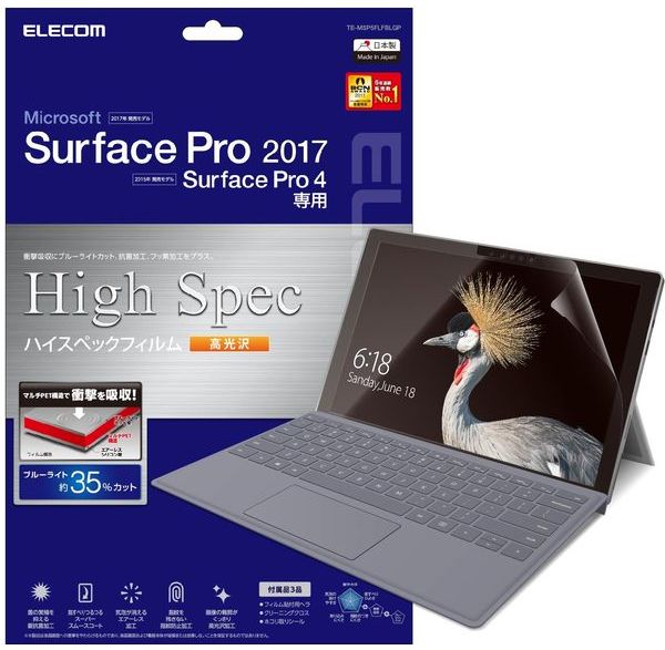 ●衝撃吸収、ブルーライトカット、スムースコートなどの多彩な機能が集約されたハイスペック高光沢タイプのMicrosoft(R) Surface(TM) Pro 2017年モデル用多機能液晶保護フィルムです。