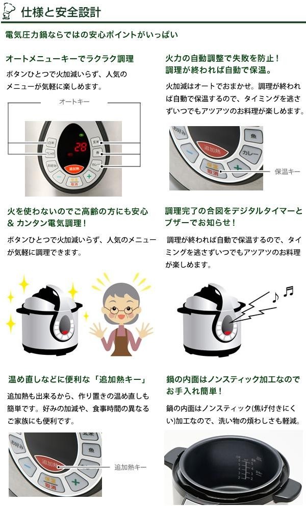 | 仕様 | 作動圧力:60kpa コード長さ:約1.5m 電源:交流100V・50/60Hz 消費電力:約800W 調理容量:約2.6L 満水容量:約4.0L 炊飯可能量/白米:2~6合・玄米:2~5合 大豆最大煮量:360g 保証期間:1年 |