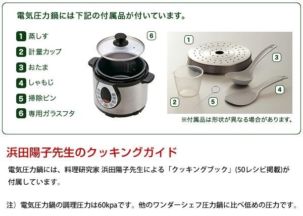 | 付属品 | 蒸しす、掃除ピン、取扱説明書、ガラス蓋、計量カップ、しゃもじ、お玉、料理研究家 浜田陽子先生の「クッキングブック」(50レシピ掲載) |