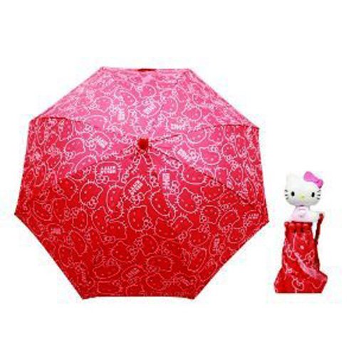 Kid size umbrella. Measures approximately 20" Tall. Easy sliding mechanism avoids pinch points. Velcro snap secures umbrella when not in use. 3D Hello Kitty Figurine measures approximately 2.5" Tall.