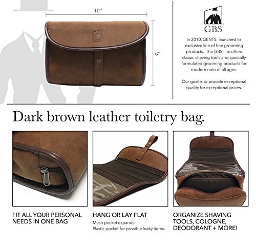 Leather Brown Dopp Bag - Toiletry bag has 1 large compartment with 2 large zippered storage areas. Water proof lining allows easy cleaning. Expandable pocket easily holds large accessories. Clear pocket for shampoos and possible leaky items. Closed Bag 10" x 3" x 6." Hangs 20"