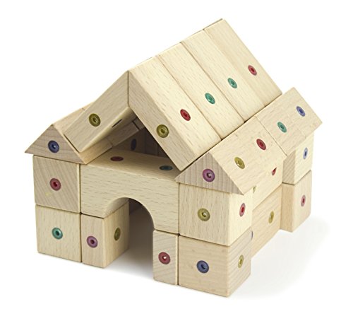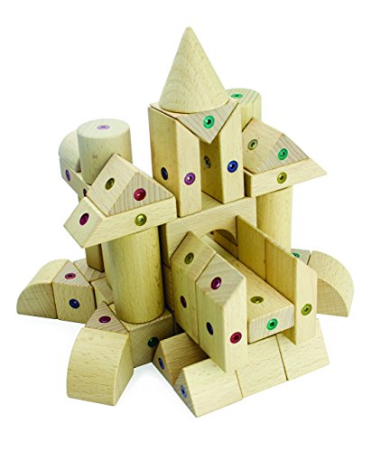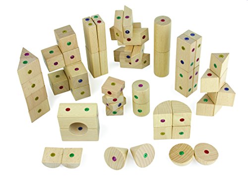 -. Feature : Set of 63 connectable wood blocks in 14 geometric shapes / Durable beech wood, embedded with powerful magnetic connection points housing free-rotating neodymium magnets / Develop fine motor skills, engage spatial thinking and geometric concepts, and encourage creativity in limitless constructive play / Create solid, reinforced sculptures that stay together until pulled apart / Naturally-finished wood and ultrasonically-welded polycarbonate housing for magnets, secured with nontoxic glue