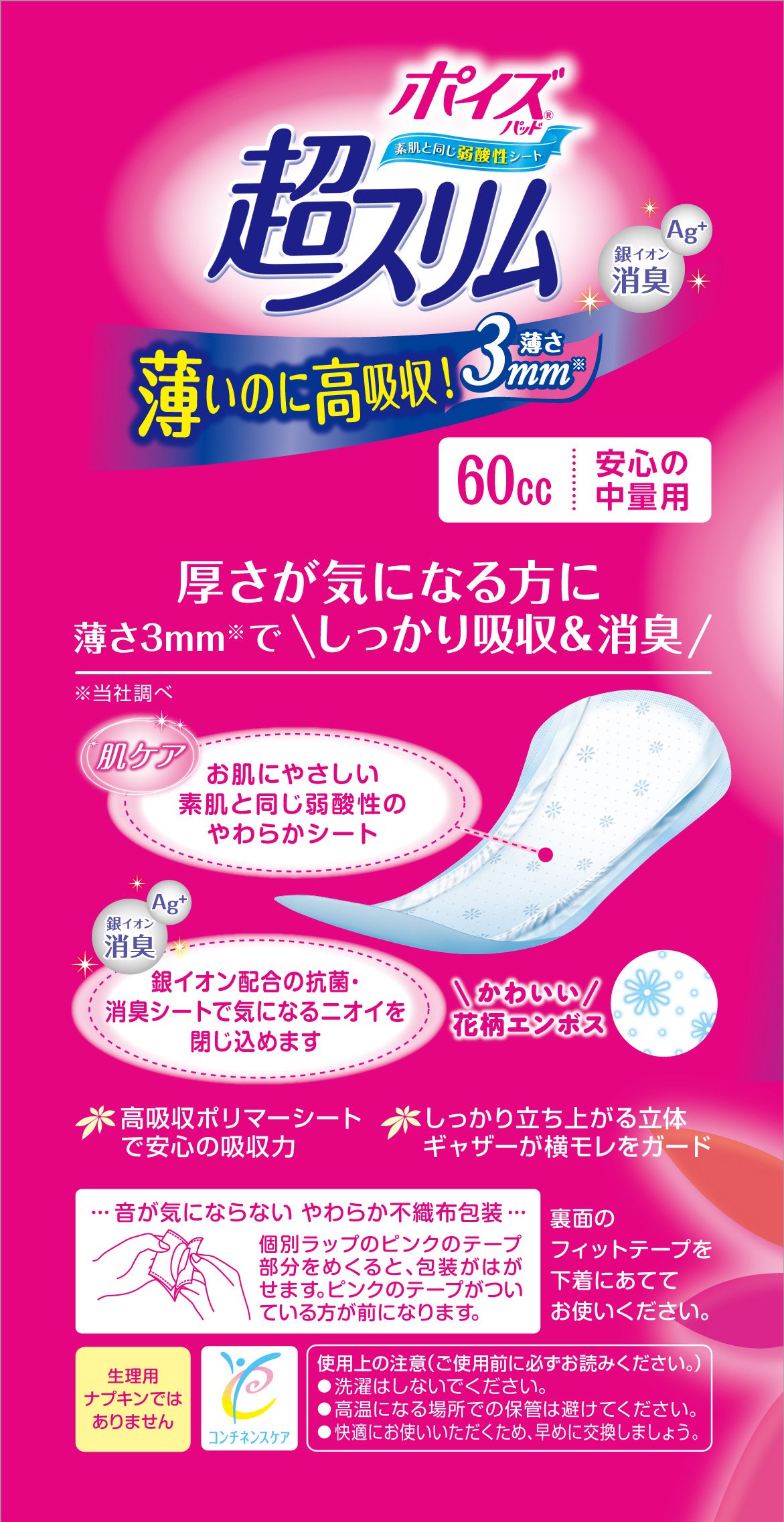 ◆ Thickness 3mm with no cracks on outer and inconspicuous ◆ Soft skin-friendly bare skin and soft weakly acidic sheet ◆ Anti-microbial / deodorant sheet with silver ion combination and double effect of deodorant polymer ensure odor ◆ Strong absorption polymer