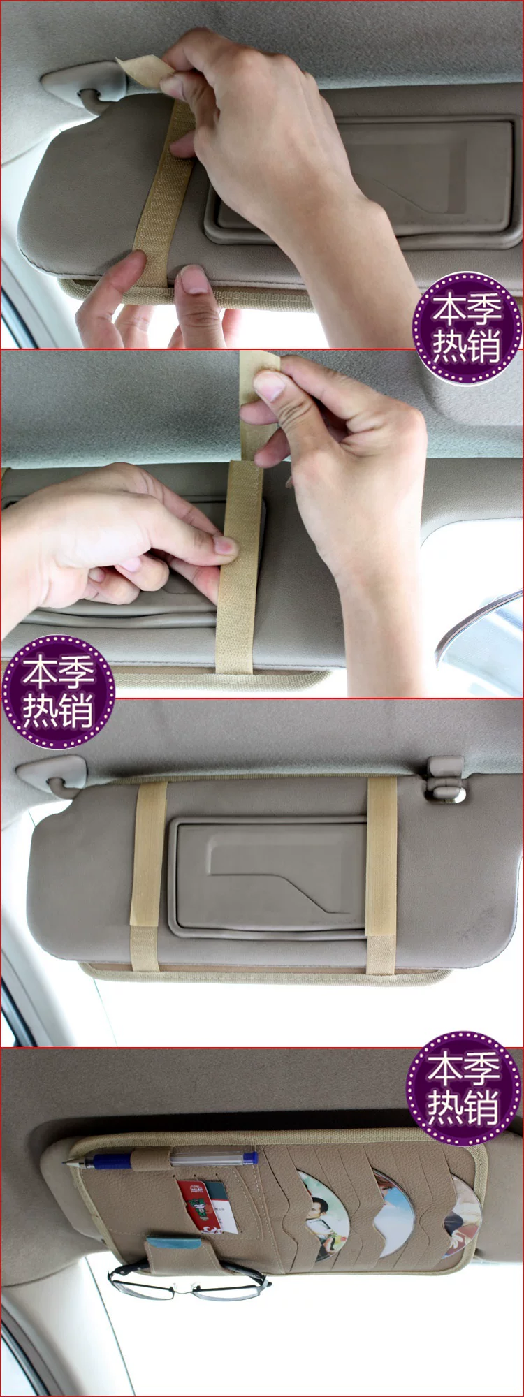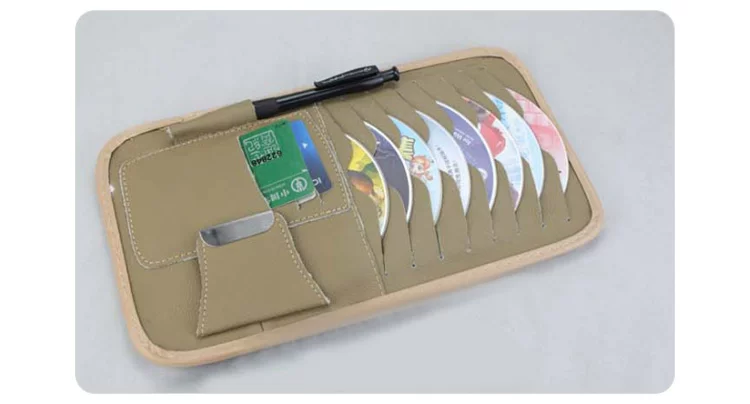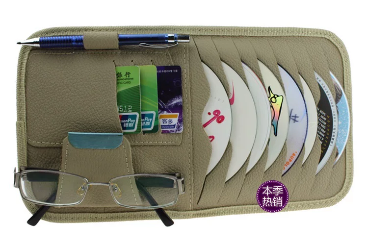 [Products] 1. It can be used to put the CD 8, ID card pocket 3, notepad pencil one. Glasses clip one; you can also clip cards, coins and bills and other debris. 2. CD visor leather bags, durable, very easy to use set in the car sun visor, washable easy.