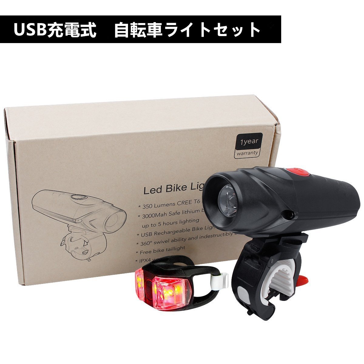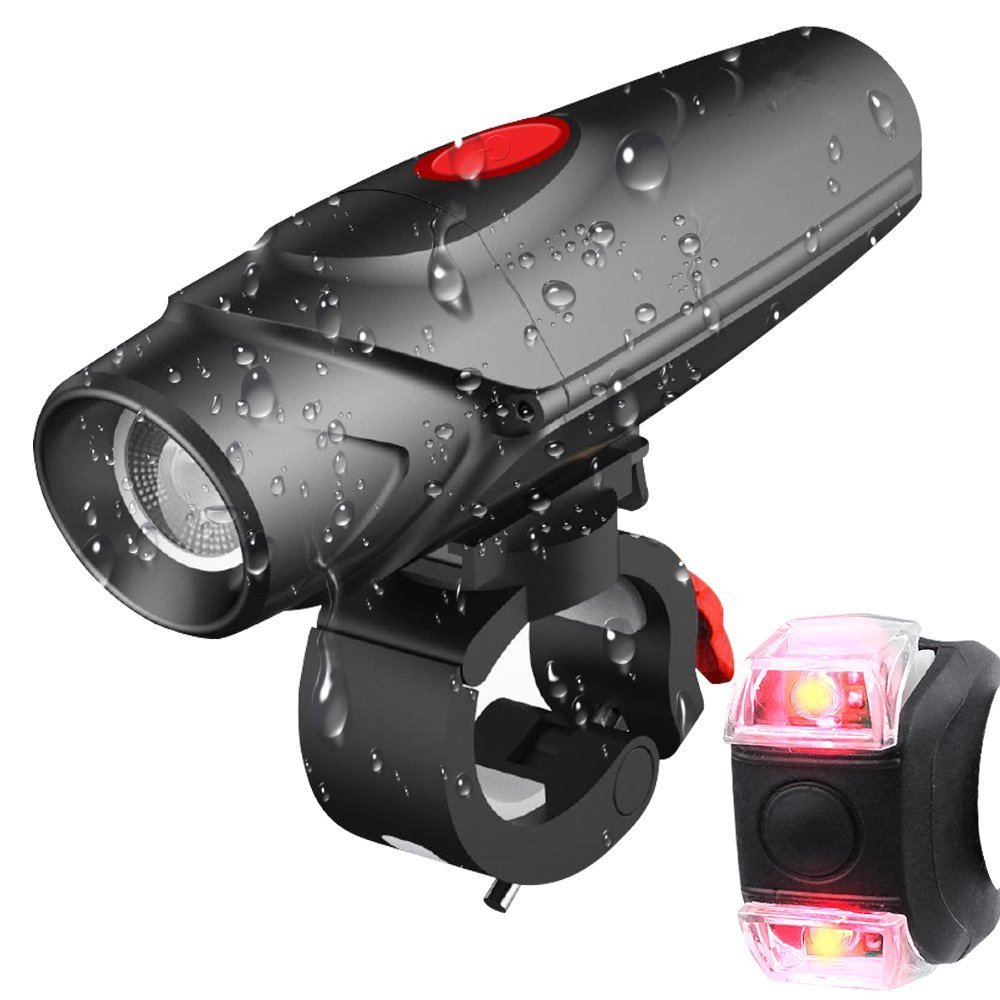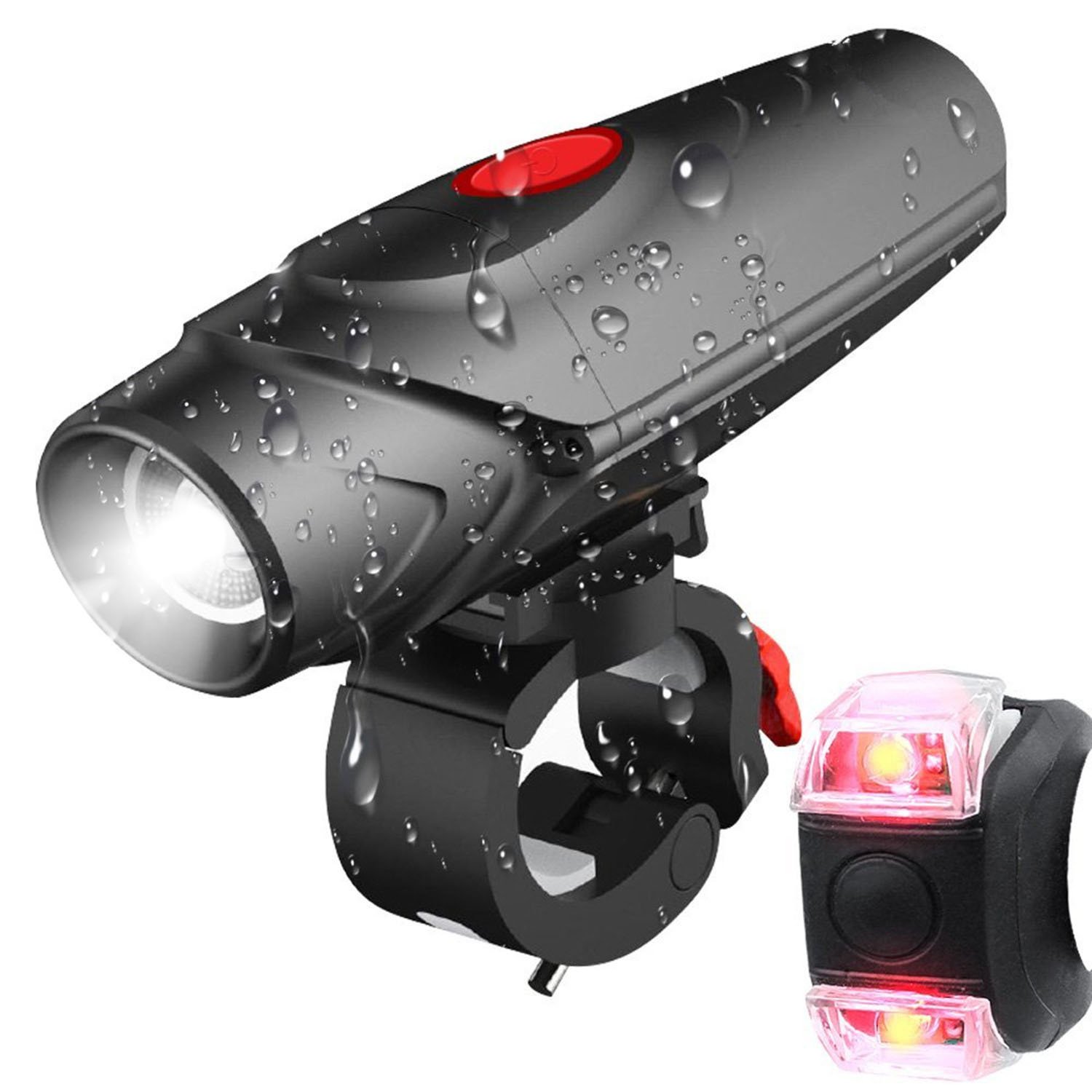 This USB rechargeable bicycle headlamp and tail light set includes waterproof IP45 super bright headlight and universal tail light.