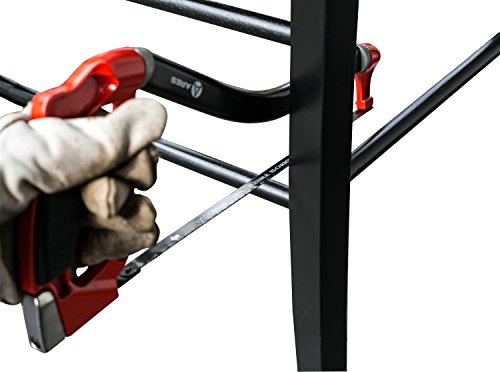 - DESIGN: Unique arc shaped frame can be turned upside down, sideways (left or right). This is accomplished through an Innovative blade notch design enables user to turn blade 90°, 180°, & 270° positions. There is an easy tensioning lock-nut keeps blades tightly in position for straight cuts.