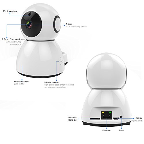 -. Feature : 1080P Video Streaming:eyeing your home with ultra-clear 1080P video streaming. / Motion Detection:App push notification when detected movement. / Night Vision:up to 32 feet,never be in the again.wifi,support wifi 802.11 B/G/N,10/100Mb. / Widely used for baby care,elderly care,pet care,car security.Anytime and anywhere,24 hours survellance. / Wifi setup with mobile device. Easy and convenient.