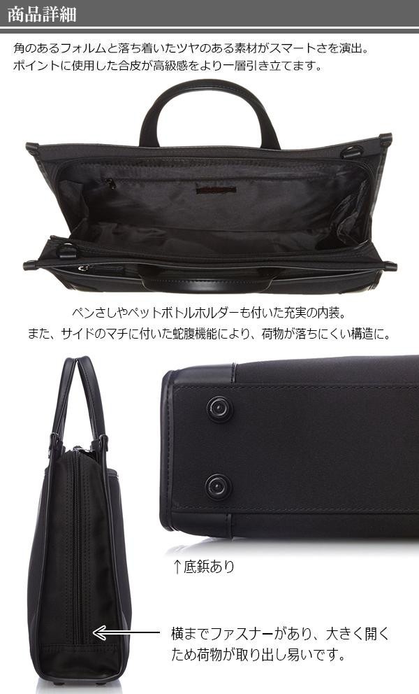 | シンプルなデザインでどんなシーンでもお使い頂けるスマートなビジネスバッグ。横までファスナーがあり、大きく開くため荷物が取り出し易いです。ポケットの内装も収納箇所が多く充実、肩に掛けられるようにショルダーベルトもついております。 |