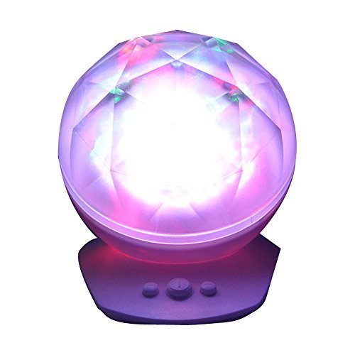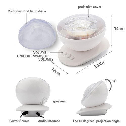 Built-in speaker, volume adjustable, plug in your personal music device Iphone, Ipod, MP3, etc., eight light projection modes in multicolors made up of Red, Blue and Green. Choose the one you like, watching the pattern and enjoy the relaxing music at night.