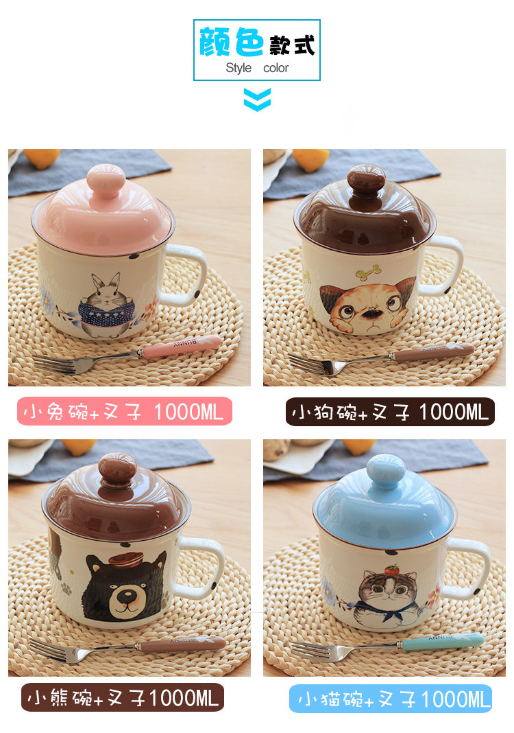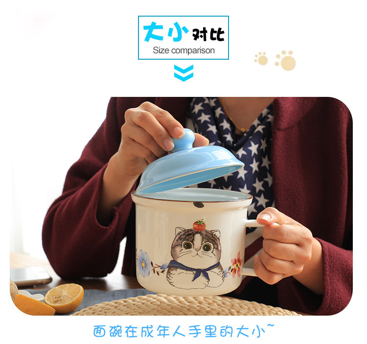 中式卡通带盖可爱泡方便面碗带把宿舍学生陶瓷碗大号汤碗家用饭碗