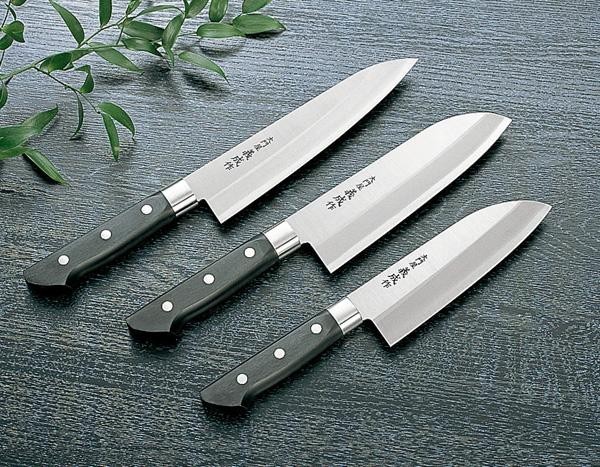 | 三徳庖丁、牛刀、リトル三徳庖丁の3本セットです。ハガネ割込み材を使用しているため切れ味バツグン!!研ぎ直しも可能です。柄を密封し、水分をシャットアウトしているので、サビにくいです。 |