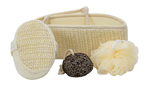 Premium Back Scrubber, Sponge, Mesh Pouf & Lava Stone Included- Treats Your Skin With Care- AyaZen Complete Bath Exfoliating Set- 4 Pieces