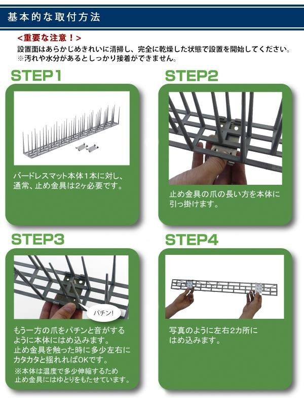用途に応じて切ったり、並べたりして、ハトの集まりそうな場所に設置するだけ。迷惑なフン害を防止して、快適な生活を守ります。更に本品はプラスチック製ですので、接近した鳥を傷つける心配も無し。先端が丸くやわらかで、簡単に加工・設置できます。 |