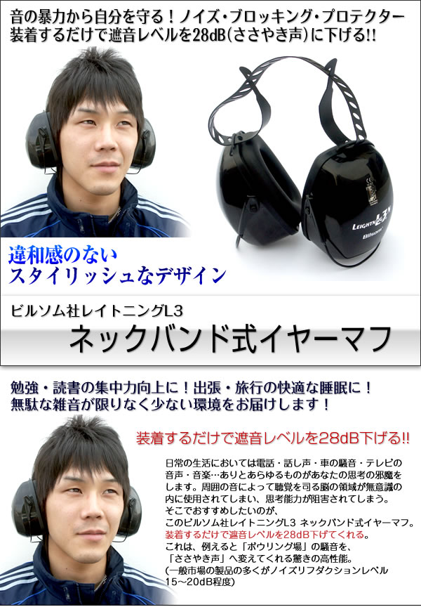 違和感のないスタイリッシュなデザイン。勉強・読書の集中力向上に!出張・旅行の快適な睡眠に!装着するだけで遮音レベルを28dBに下げ、無駄な雑音が限りなく少ない環境をお届けします!サイズ/幅16×高11.5×奥行き13.5cm ※サプライヤー直送品【商品名】ビルソム社レイトニングL3 ネックバンド式イヤーマフ