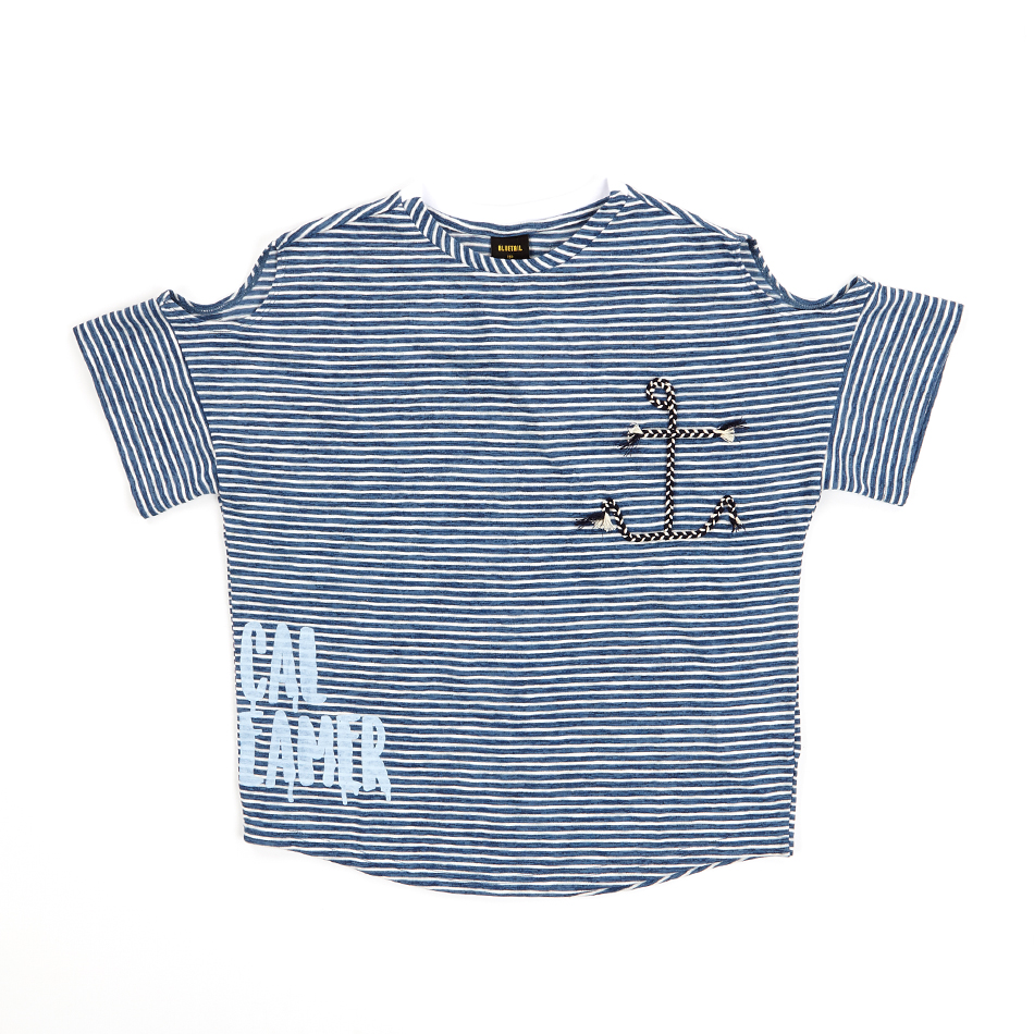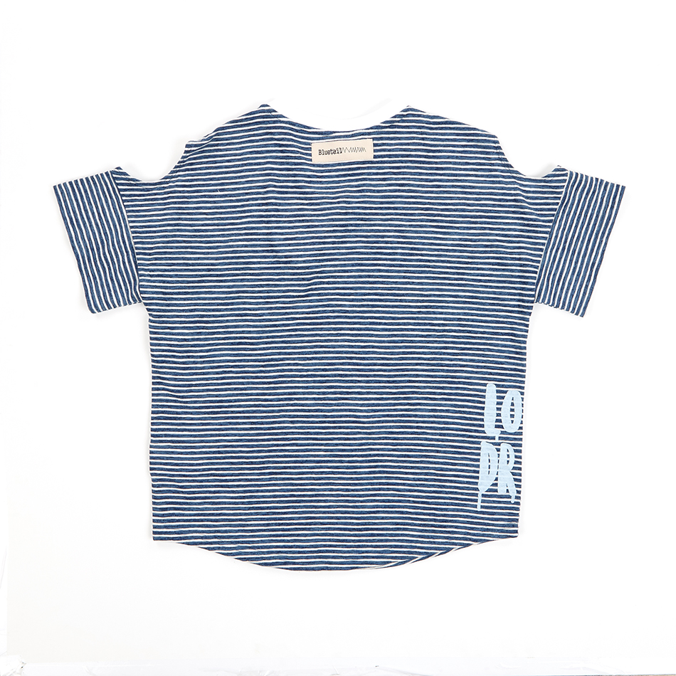 박시한 실루엣으로 제안한 마린 블루 스트라이프 티셔츠입니다.