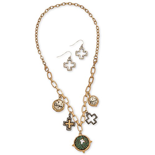 Feel at peace with this christian themed necklace / bracelet and earring set. Featuring cross shaped and christian themed charms on a 17" necklace that converts into a bracelet, this gold finish jewelry set also comes with a pair of cross shaped earrings for an all in one matching set.