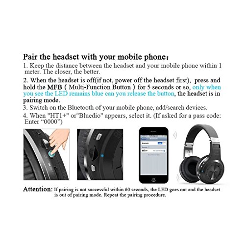 Feature : Iconic powerful bass resonance of Bluedio: Unexpected 57mm ultra-large dynamic drivers, turbine style housing, with iconic Bluedio surging low-frequency shock, let you feel the bass resonate deep in the chest, enjoying the best sound quality. / Customized function: Audio Sharing allows you to connect to another H headphone via audio cable, share music feast with your friends instantly(*recommended to use headphones with impedance of 32Ω or higher). Seamless connect two Bluetooth devices simultaneously, listen to music or enjoy blockbusters / Comfortable to wear: Its ear cup and headband top are padded with sufficient foam and covered with soft leather. What you may not notice is that we adjust the headband, based on Ergonomics theory, to fit all head sizes. / Bluetooth 4.1 Chip: It's the latest Bluetooth chip, which can transmit data at high speed and bring you smooth music experience. / Ultra low power consumption brought about 40 hours to 45 hours, call, 1625 hours standby (about 67 days), is 3 times the average of the Bluetooth Headset.