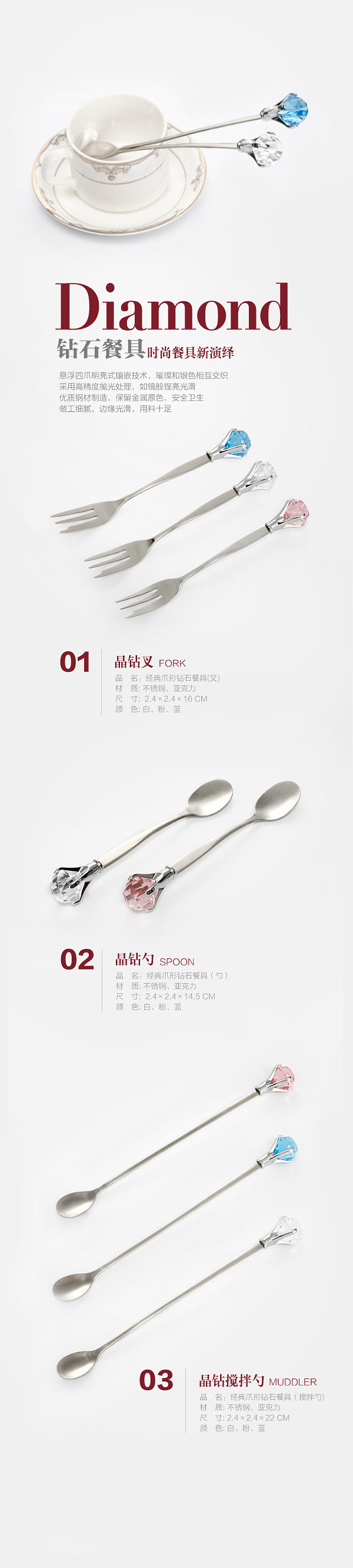 Product size; fork 2.4 * 2.4 * 16cm; spoon 2.4 * 2.4 * 14.5cm